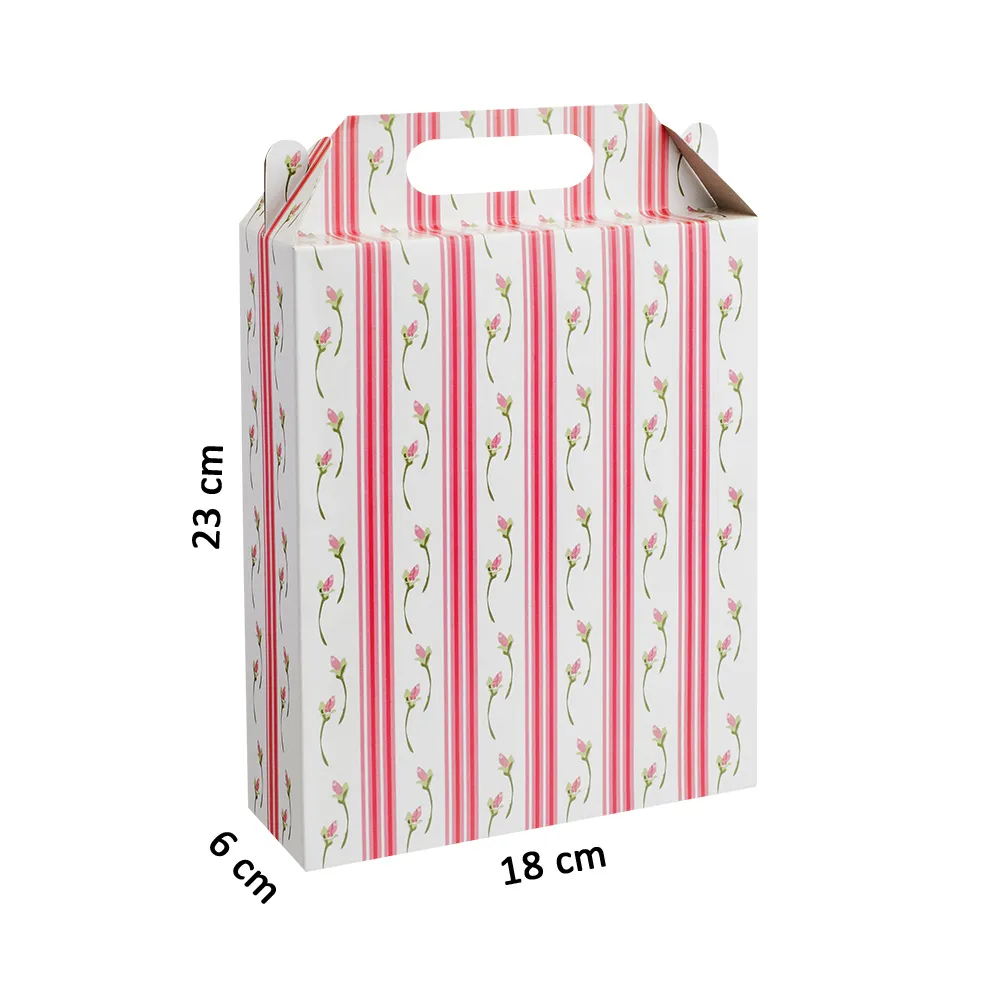 Com alça montável essa caixa de 23cm de altura, 18cm de largura e 6cm de profundidade, pode armazenar peças de vestuário, entre roupas e acessórios. É feita de papel duplex de 250g.