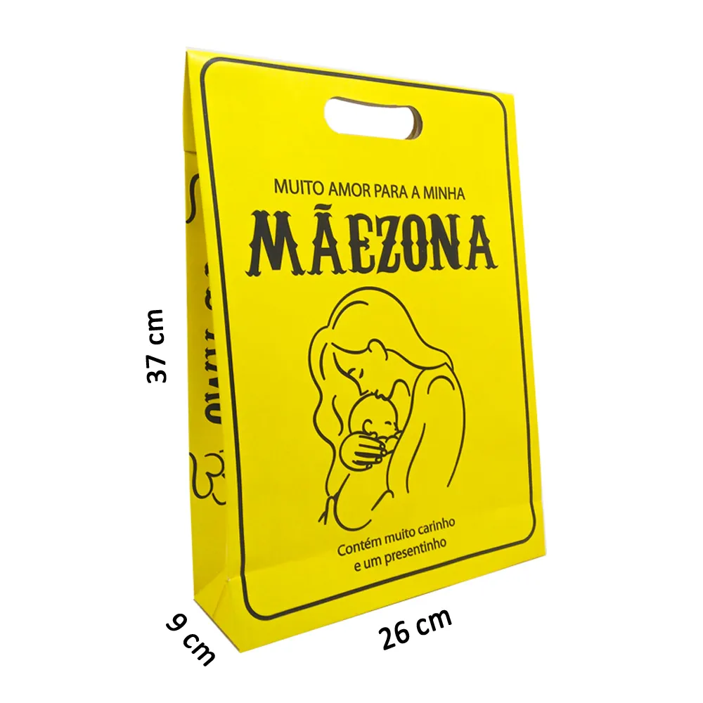 Com 37 cm de altura, 26cm de largura e 9cm de profundidade, essa sacola personalizada, pode ser usada para acomodar roupas, cosméticos e calçados. Ela tem a alça vazada e é produzida com papel duplex 225g.
