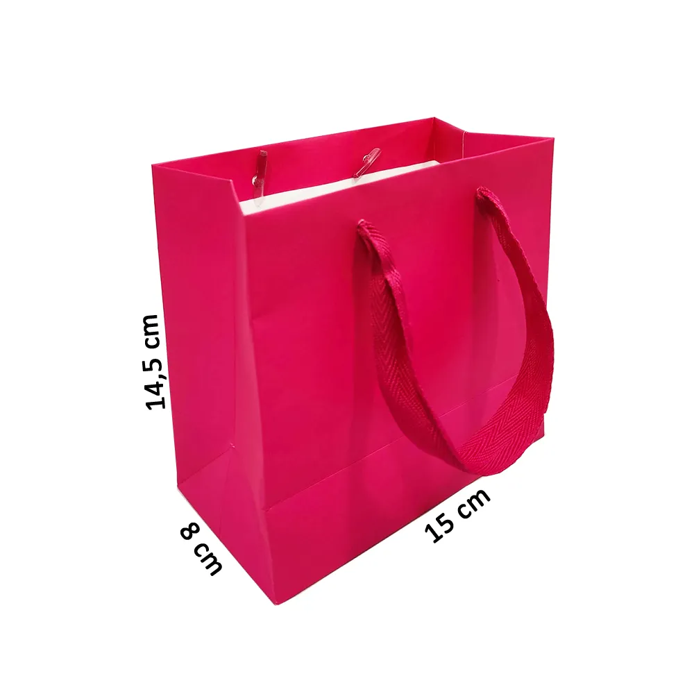 A sacola Pink Handmade, produzida com papel Off Set 120 ou 150g/m², mede 14cm altura, 15cm de largura e 8cm de profundidade. Tem alças de gorgurão, ponteira de acetado na cor rosa pink e reforço na base. Assim, é uma ótima opção para produtos miúdos e delicados.